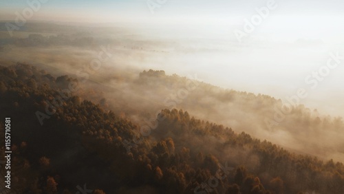 © AlexGo, Naklejka premium Foggy autumn fields and forests at sunrise