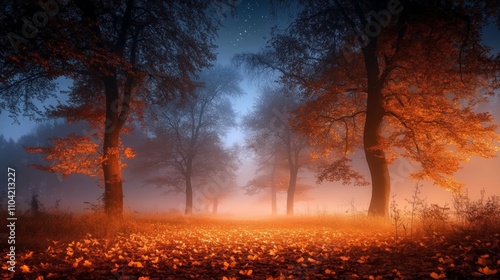 © Ludmila, Obraz premium Foggy Autumn Forest with Glowing Orange Leaves and Mysterious Atmosphere