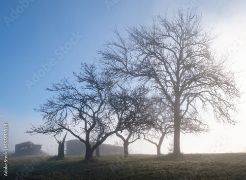 © wildman, Fototapeta premium Foggy autumn mountain sunrise scene. Peaceful picturesque traveling, seasonal, nature and countryside beauty concept scene.