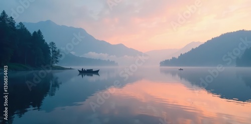 Fototapeta premium Foggy bodensee lake with silhouetted boats and sky, peaceful, calm