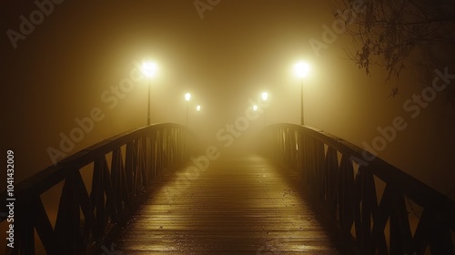 © Tuachan, Obraz premium Foggy Bridge at Night with Illuminating Lights