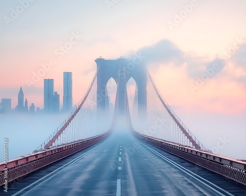 © Armaya, Obraz premium Foggy Bridge Cityscape Sunrise.