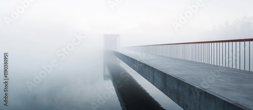 © STwul, Fototapeta premium Foggy bridge extending to a distant structure over still water.