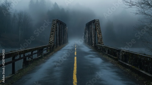 Naklejka premium Foggy Bridge Road, Forest, Mystery