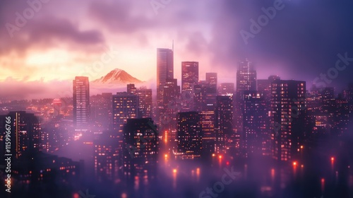 © bulegendut, Obraz premium Foggy city skyline at sunset, mountain in background.