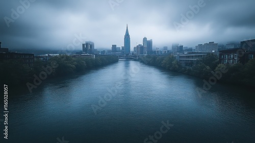 © RONNY, Fototapeta premium Foggy city skyline reflected in calm river.
