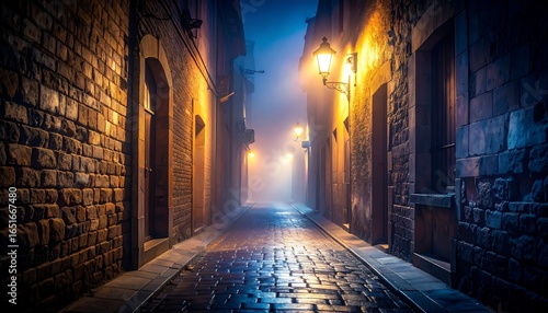 © Murai, Fototapeta premium Foggy cobblestone street at night.
