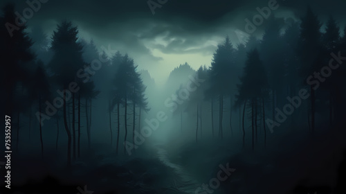 Fototapeta premium Foggy dark forest path scary melancholy background