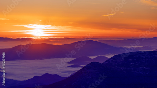 Fototapeta premium Foggy dawn in the mountains, drone view.