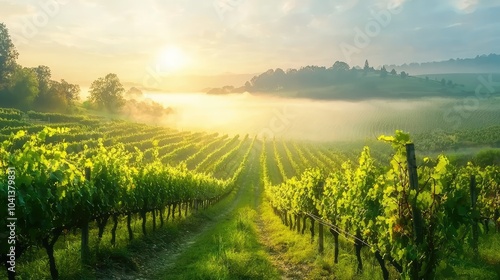 © Tuachan, Naklejka premium Foggy Dawn Over Tranquil Vineyard Landscape