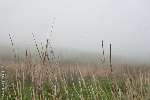 © Evgeniya, Obraz premium Foggy day and view of dry grass in the mist