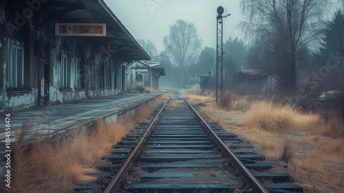 © ABX, Fototapeta premium Foggy Deserted Train Station with Overgrown Rails