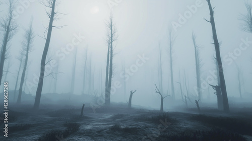 Obraz premium Foggy desolate forest with leafless trees creating an eerie atmosphere