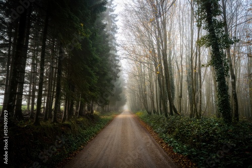 © sun, Fototapeta premium Foggy dirt road stretching through dense forest with tall evergreen and deciduous trees on either side, evoking a quiet and mysterious atmosphere