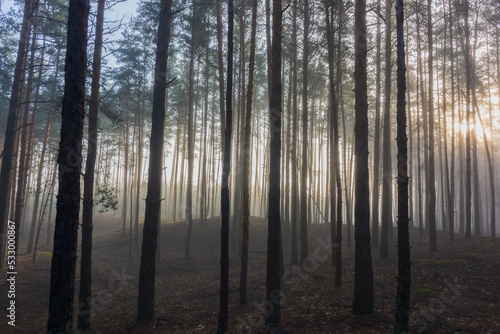 Fototapeta premium Foggy early morning in a pine forest.