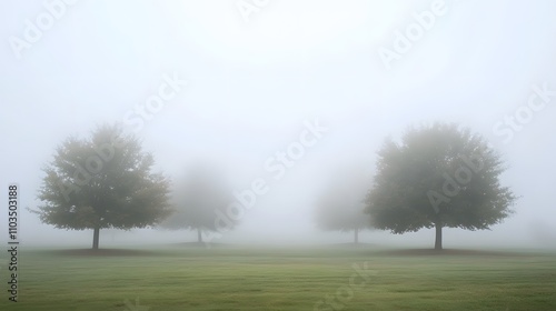 Fototapeta premium Foggy Field with Trees Standing Tall in Mist