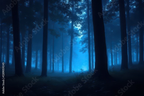 Naklejka premium Foggy forest at night with misty trees and autumn foliage