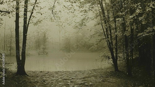 Naklejka premium Foggy Forest Clearing with Soft Light and Trees