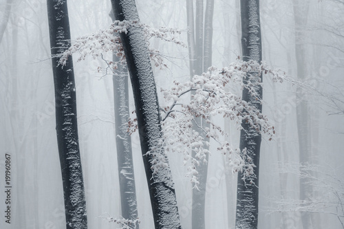 © bonciutoma, Fototapeta premium Foggy forest detail of trees covered in snow