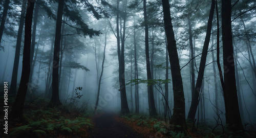 © sevenSkies, Naklejka premium Foggy forest eerie silence abstract background