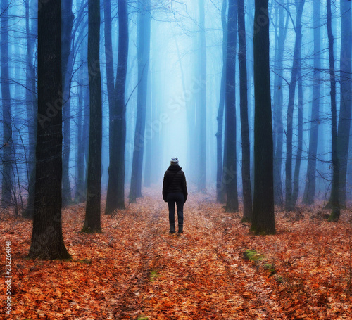 © sergnester, Fototapeta premium foggy forest. girl in the autumn forest. foggy morning