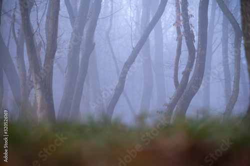 © andrei, Obraz premium Foggy forest in mist. A mystical look of the forest