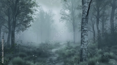 Naklejka premium Foggy forest, misty landscape. Mysterious trees, dark woods. Morning light, autumn magic. Spooky paths, Halloween vibes. Rainy weather, gloomy shadows. Enchanted environment,