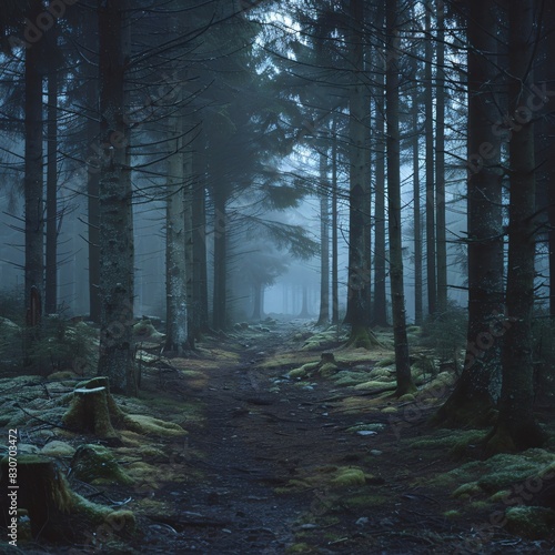Obraz premium Foggy Forest Path: A Mystical Encounter with Nature