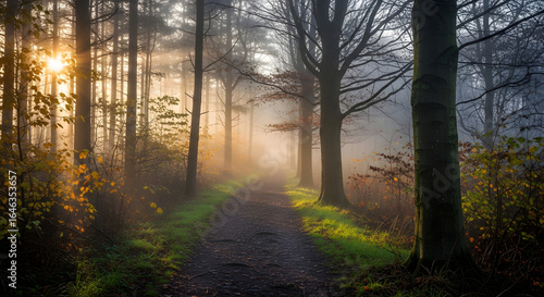 © visualdalamframe, Obraz premium Foggy Forest Path at Sunrise A Mystical Autumn Morning