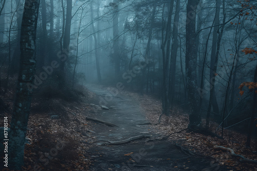 Obraz premium Foggy forest path, mysterious atmosphere, misty woods trail