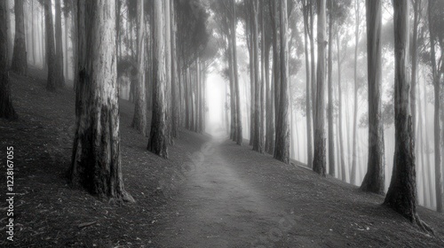 Naklejka premium Foggy Forest Path Through Tall Eucalyptus Trees