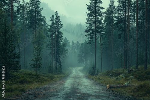 Obraz premium Foggy Forest Path with a Fallen Log