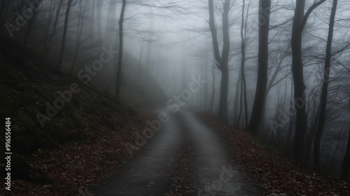 Naklejka premium Foggy Forest Pathway in Autumn with Bare Trees and Damp Leaves