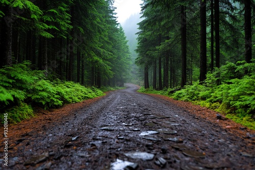Obraz premium Foggy forest road surrounded by pine trees, eerie and atmospheric