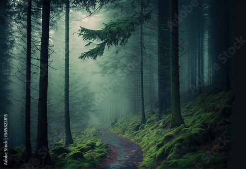 © Novanture, Obraz premium foggy forest scene created with Generative AI technology