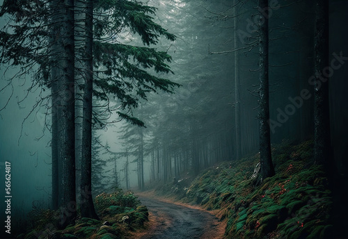 Fototapeta premium foggy forest scene in darken colors created with Generative AI technology