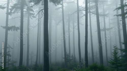 Naklejka premium Foggy forest scene with misty atmosphere and old-growth fir trees, rustic...