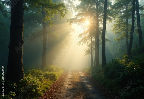 © Yaraslava, Naklejka premium Foggy Forest Sunbeams Enchantment Ethereal Light Sun Rays Mystical Wilderness Serenity Atmosphere