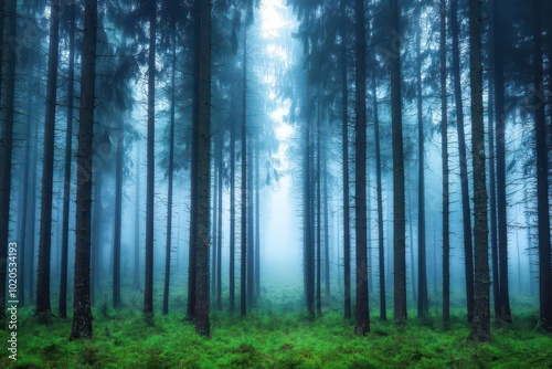 Obraz premium Foggy forest, tall trees fading into mist, eerie yet peaceful atmosphere