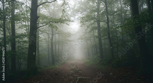 Naklejka premium Foggy Forest Trail Path Through Green Trees Landscape Nature Scene