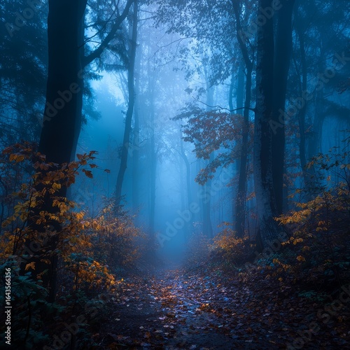 © Anan, Obraz premium Foggy Forest with Fall Pumpkins in Enchanted Landscape