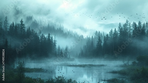 © Gerges, Fototapeta premium Foggy Forest With Lake in Foreground
