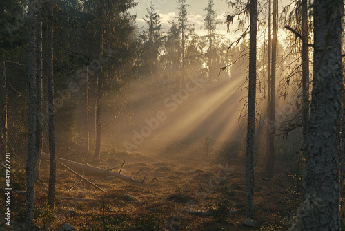© pavlofox, Obraz premium Foggy forest with sunlight breaking through trees