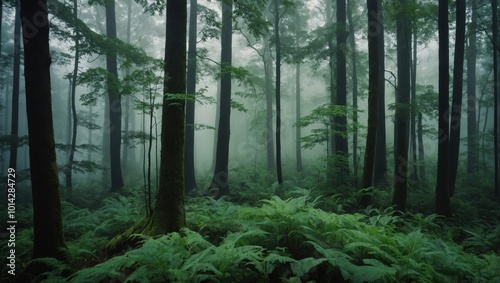 Fototapeta premium Foggy Forest with Tall, Slender Trees and Moss-Covered Ground