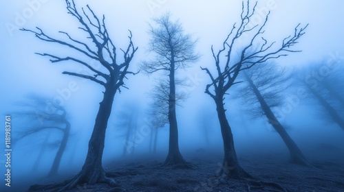 Obraz premium Foggy Forest with Twisted, Leafless Trees