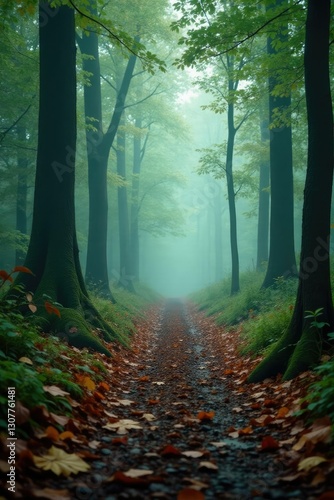 Fototapeta premium Foggy forest with wet leaves scattered on the ground, atmosphere, woods, green