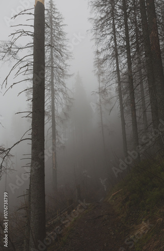 © Kunojr, Obraz premium Foggy Forest with Winding Path