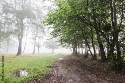 © photo_superteam, Fototapeta premium Foggy green summer forest landscape