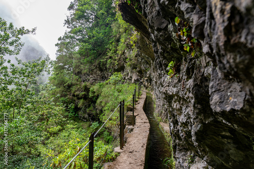 Fototapeta premium Foggy hiking path in the forest in Levada do Caldeirao Verde Trail, Madeira island, Portugal.