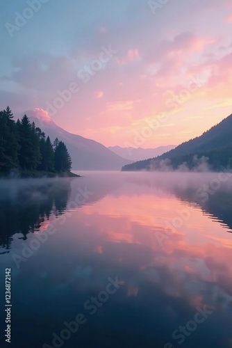 Fototapeta premium Foggy lake on a serene evening with soft focus, serene, mist, evening